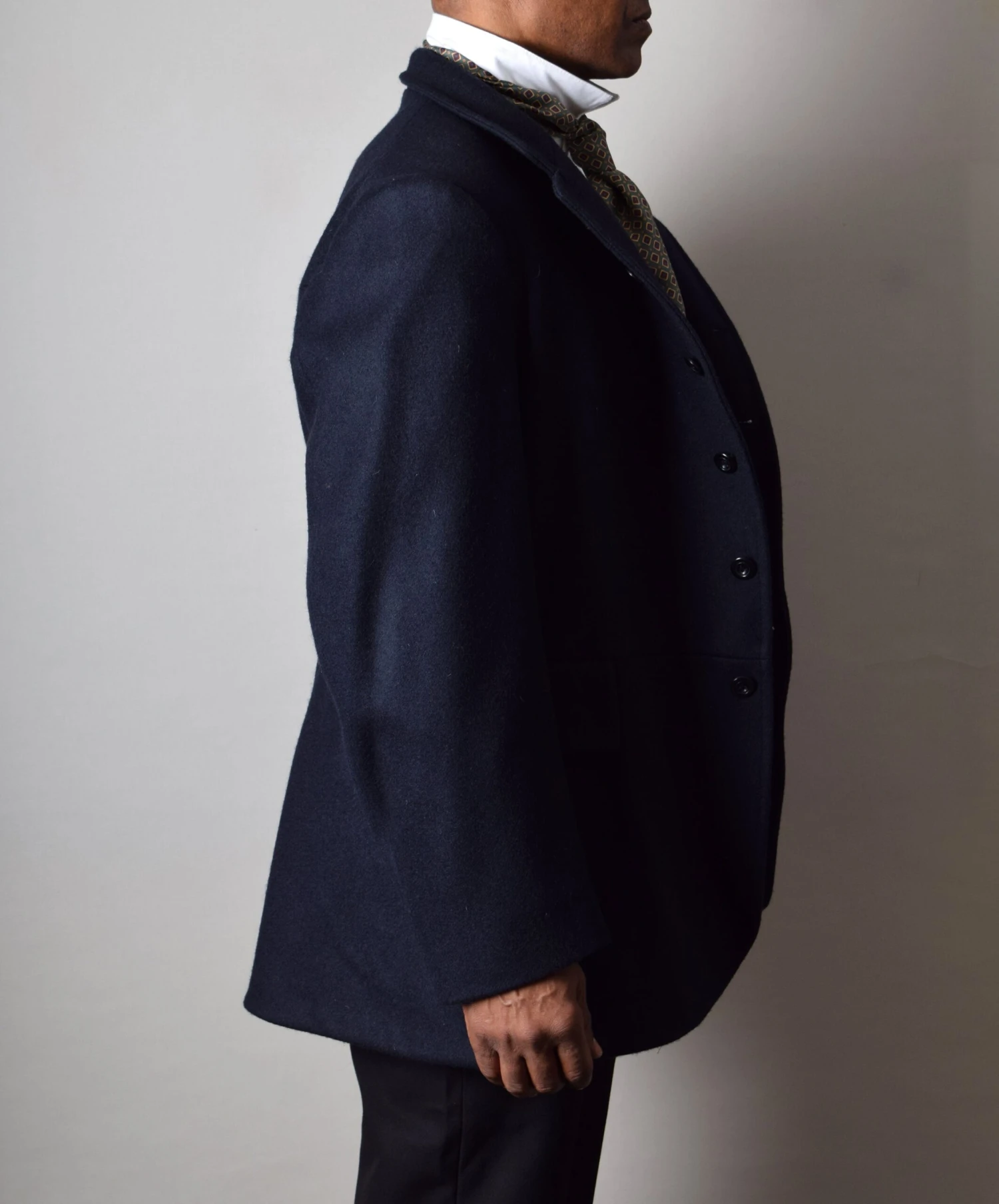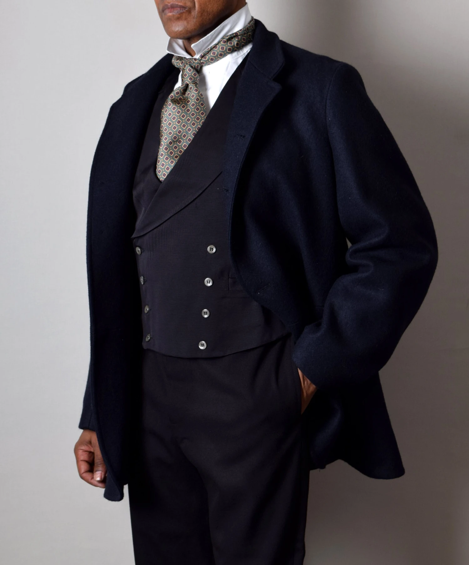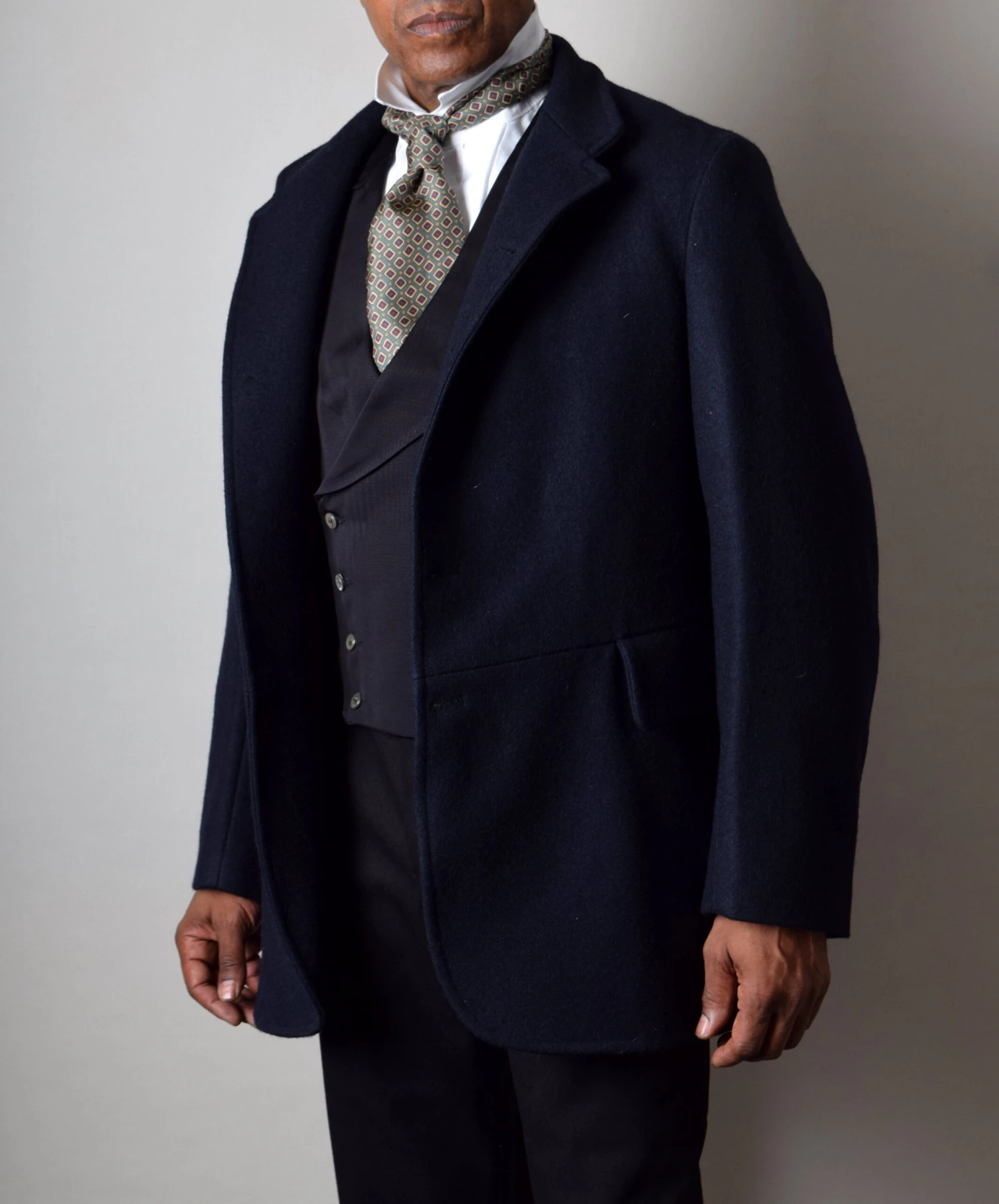 This is a direct copy of an original Victorian Coachman’s coat. It has a waist seam with functioning external pockets and inside we have retained the very large lower pockets along with a top jetted one.