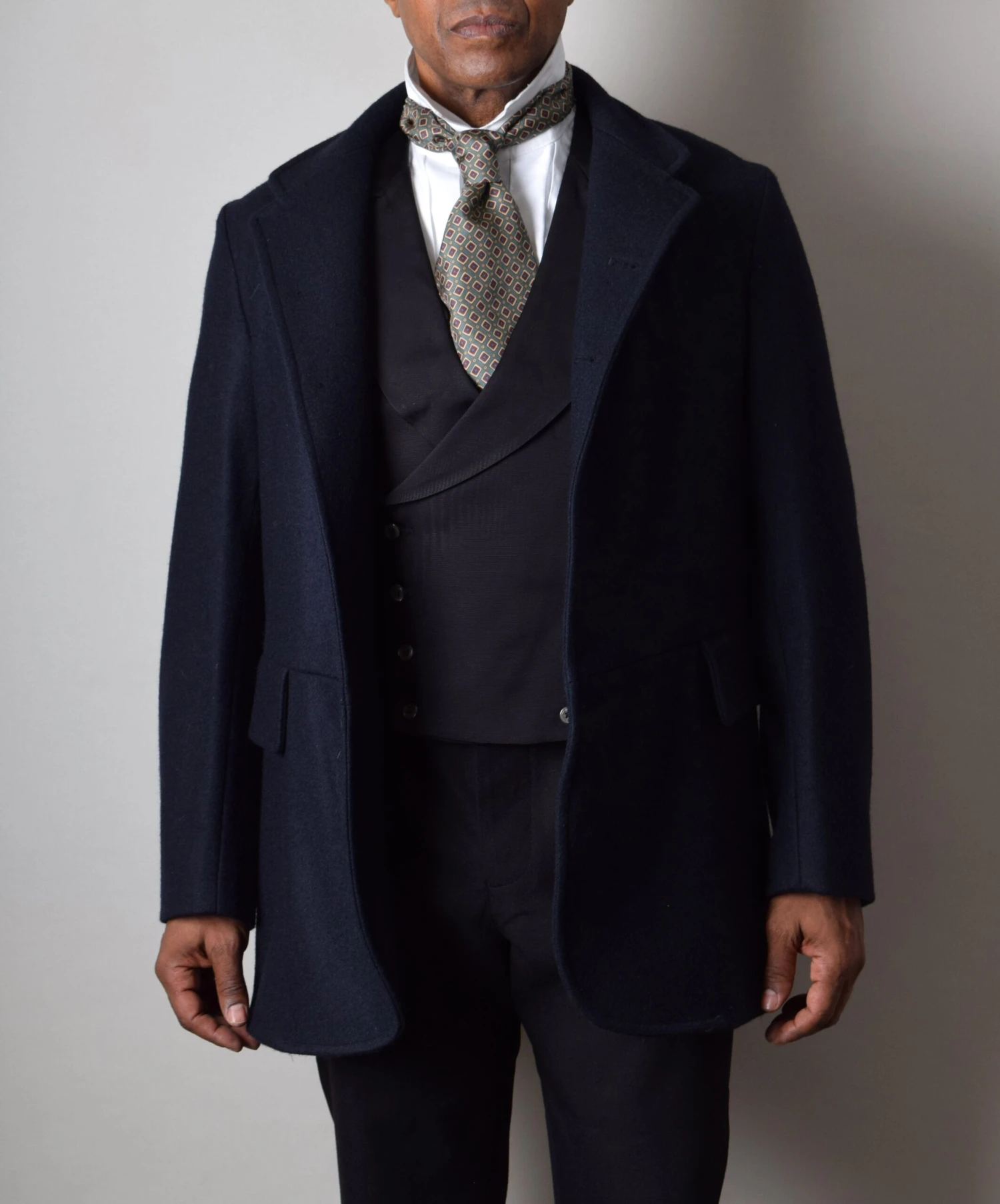 It has five buttons and can be worn buttoned up to the top for a very distinctive late C19th look or on the next button down for a more relaxed appearance.