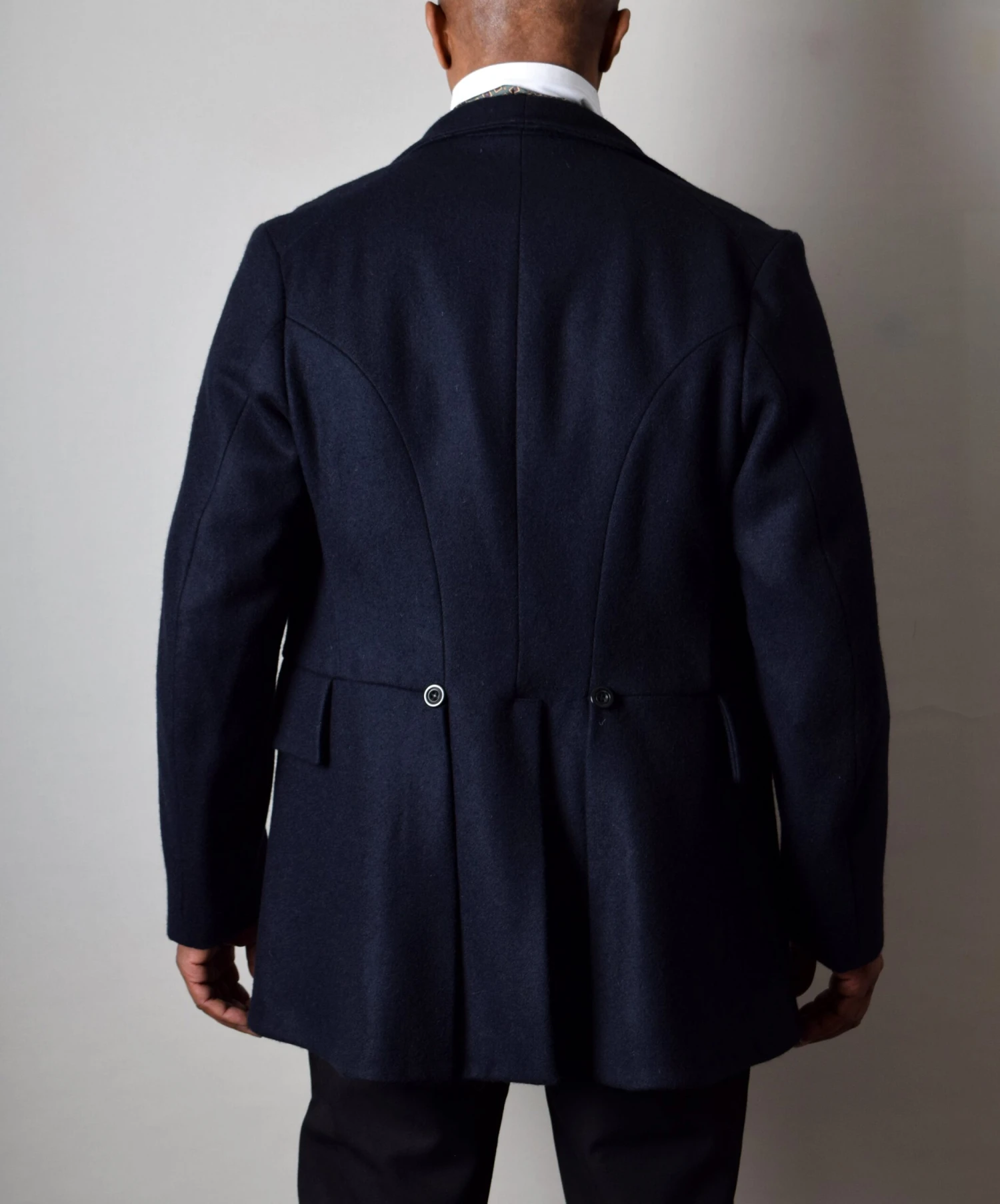 The back has a particularly distinctive cut with correct seaming and central vent in the skirt.