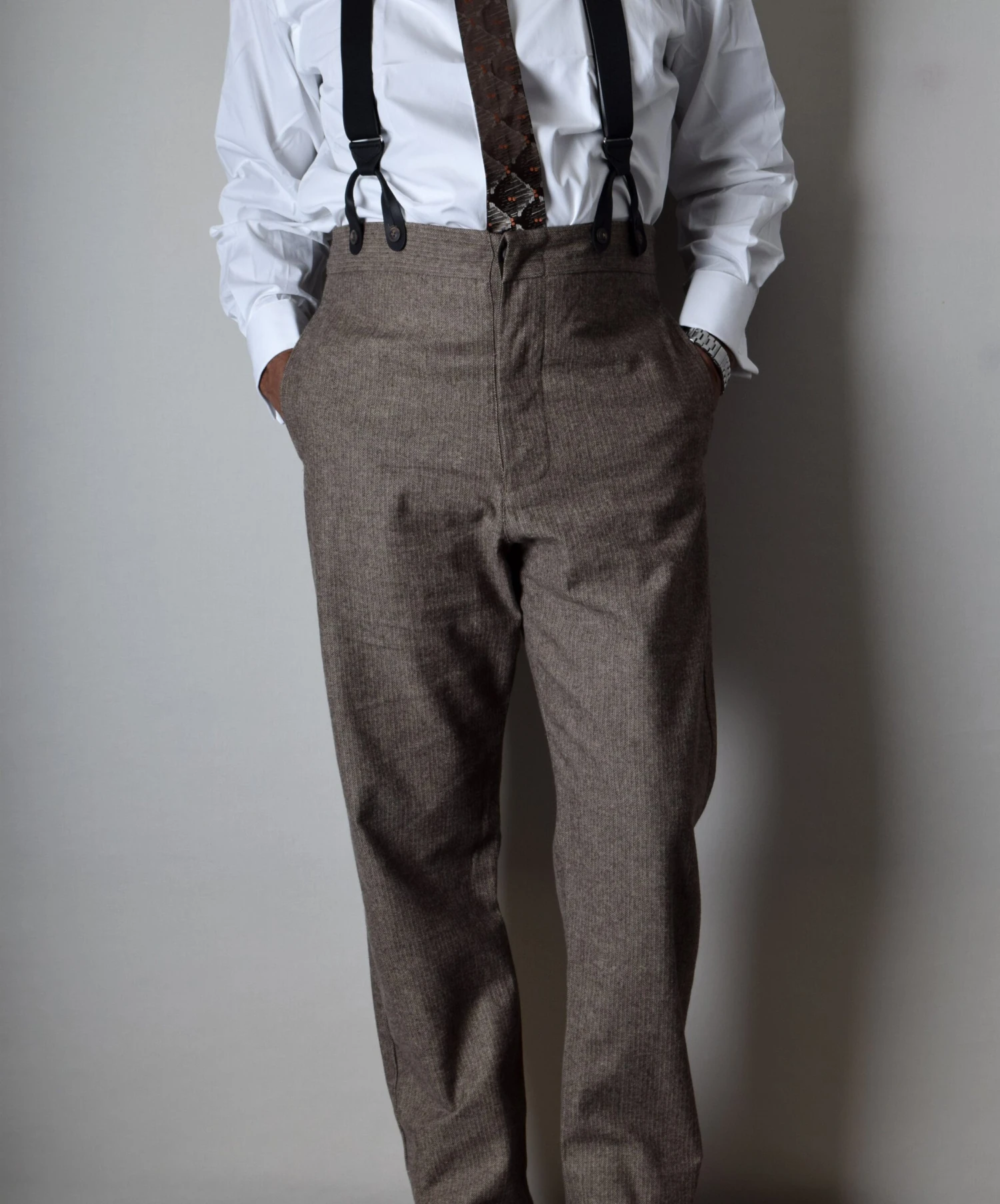 They are best worn with our button braces as they should sit higher on the body than the modern position which is lower towards the hips.