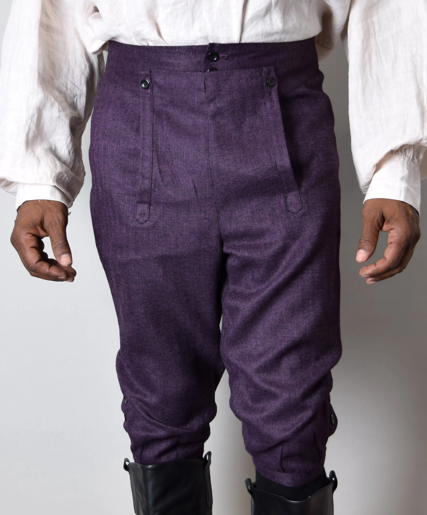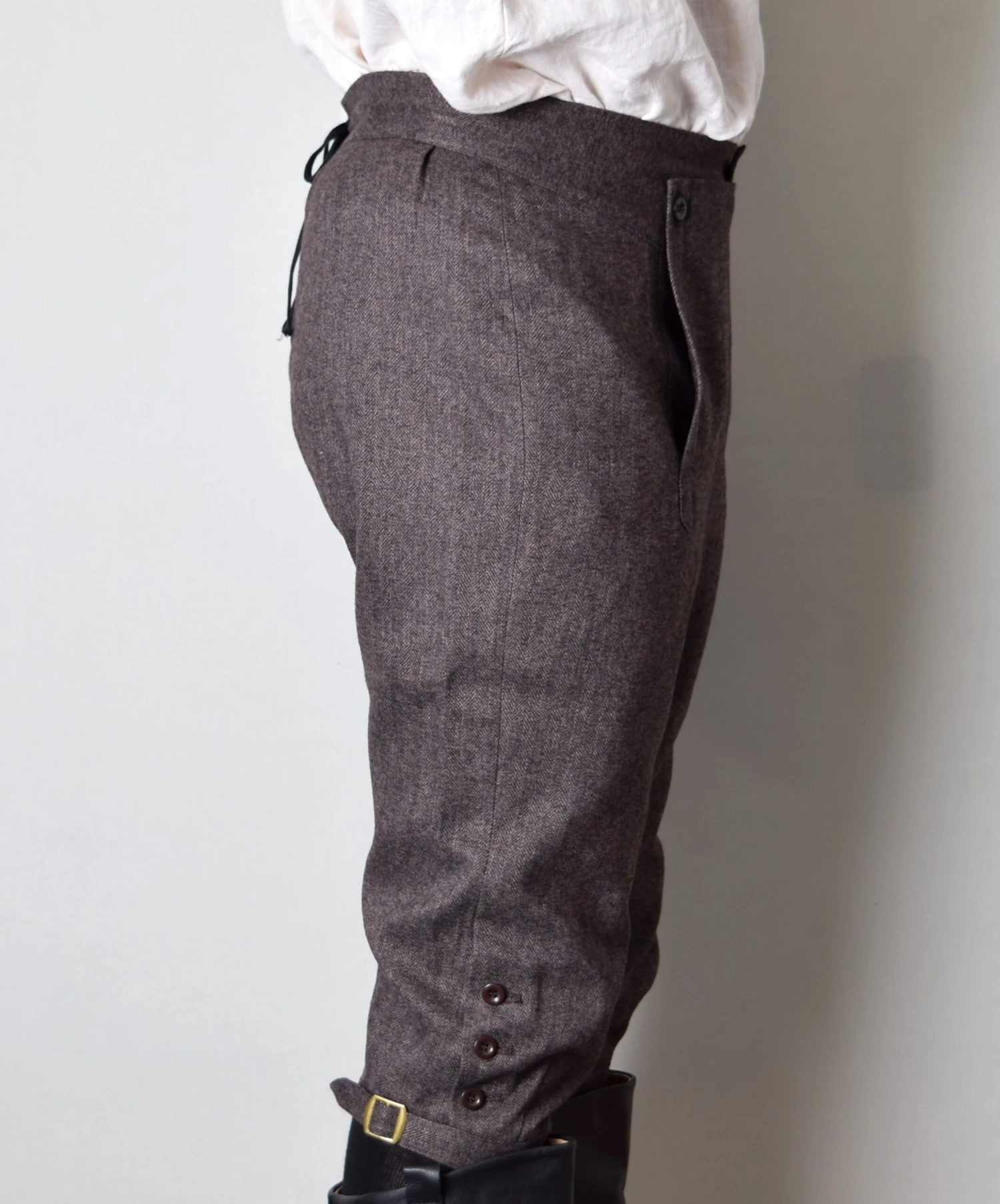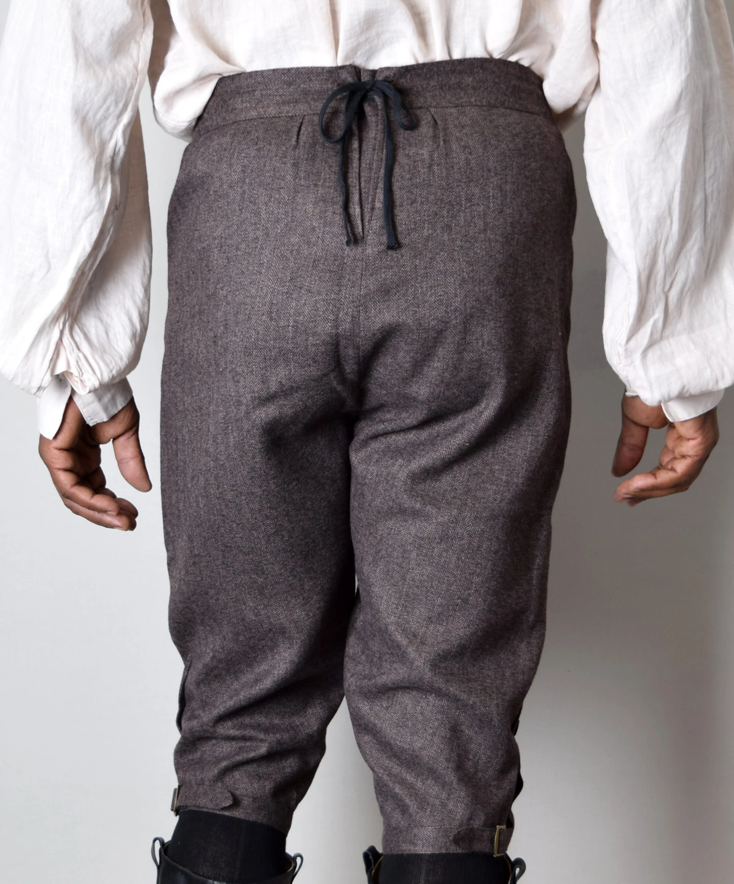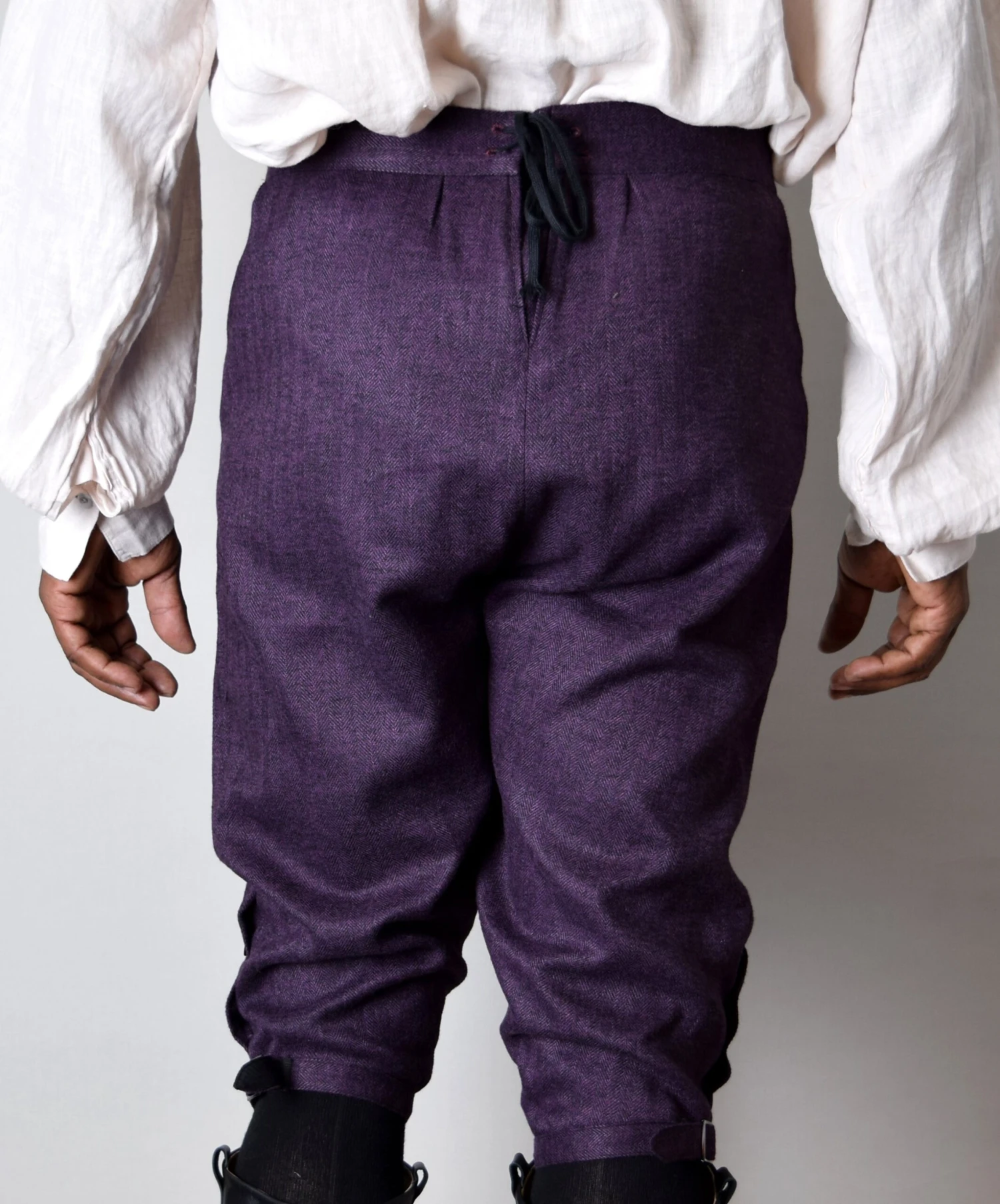 We are pleased to be able to offer this close version of C18th knee breeches. The patterns have been endlessly refined and we are now confident that they are not only authentic but reasonably flattering – the very authentic baggy bum has been in-authentically reduced!