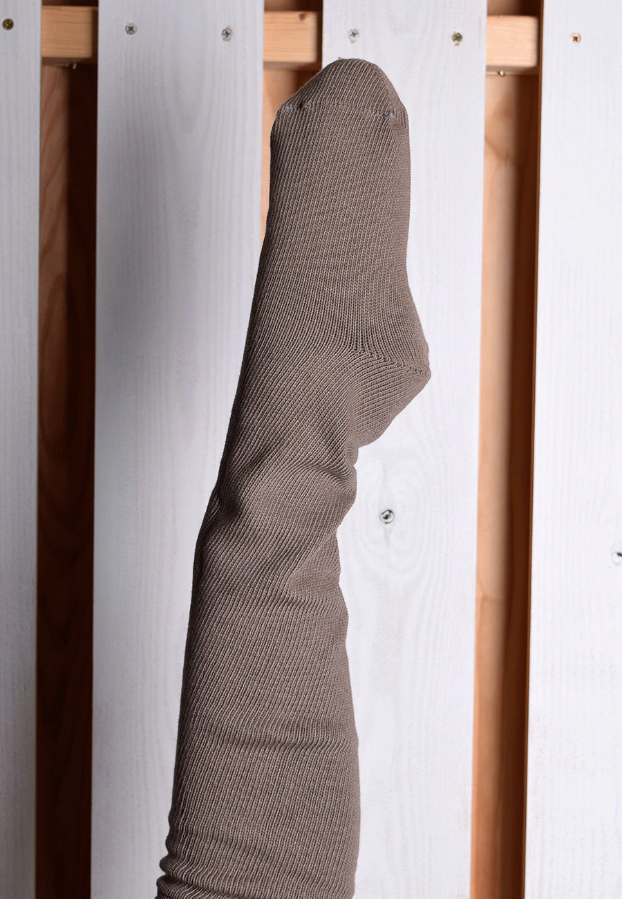 These cotton stockings are thigh high and come in a range of solid colours. Please note the dyed colourways can be slightly irregular as they are hand dyed and will vary from one batch to another.