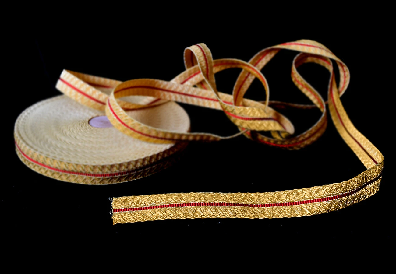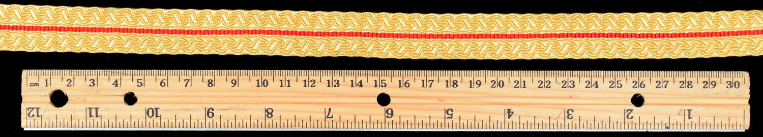 This gold metallic braid is known as B&S which stands for Bias and Stand, a traditional pattern. It is 20 mm or 3/4″wide.