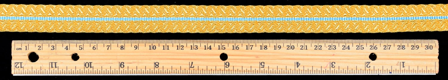 This metallic gold Mylar braid has a central blue stripe and is 20mm wide or 3/4″.