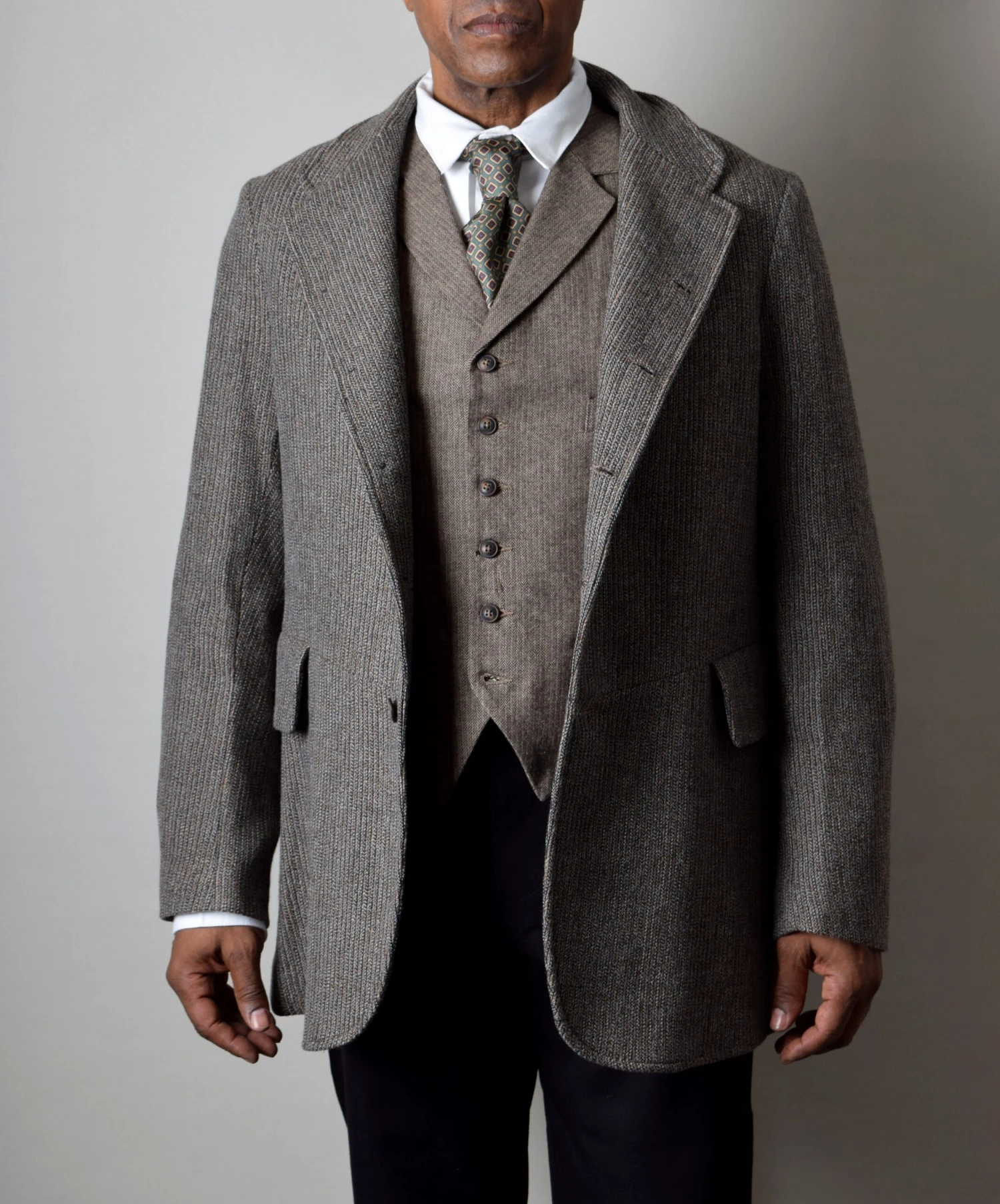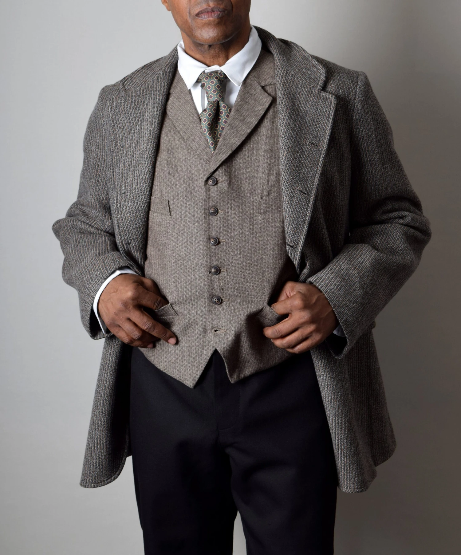 It has five buttons and can be worn buttoned up to the top for a very distinctive late C19th look or on the next button down for a more relaxed appearance.