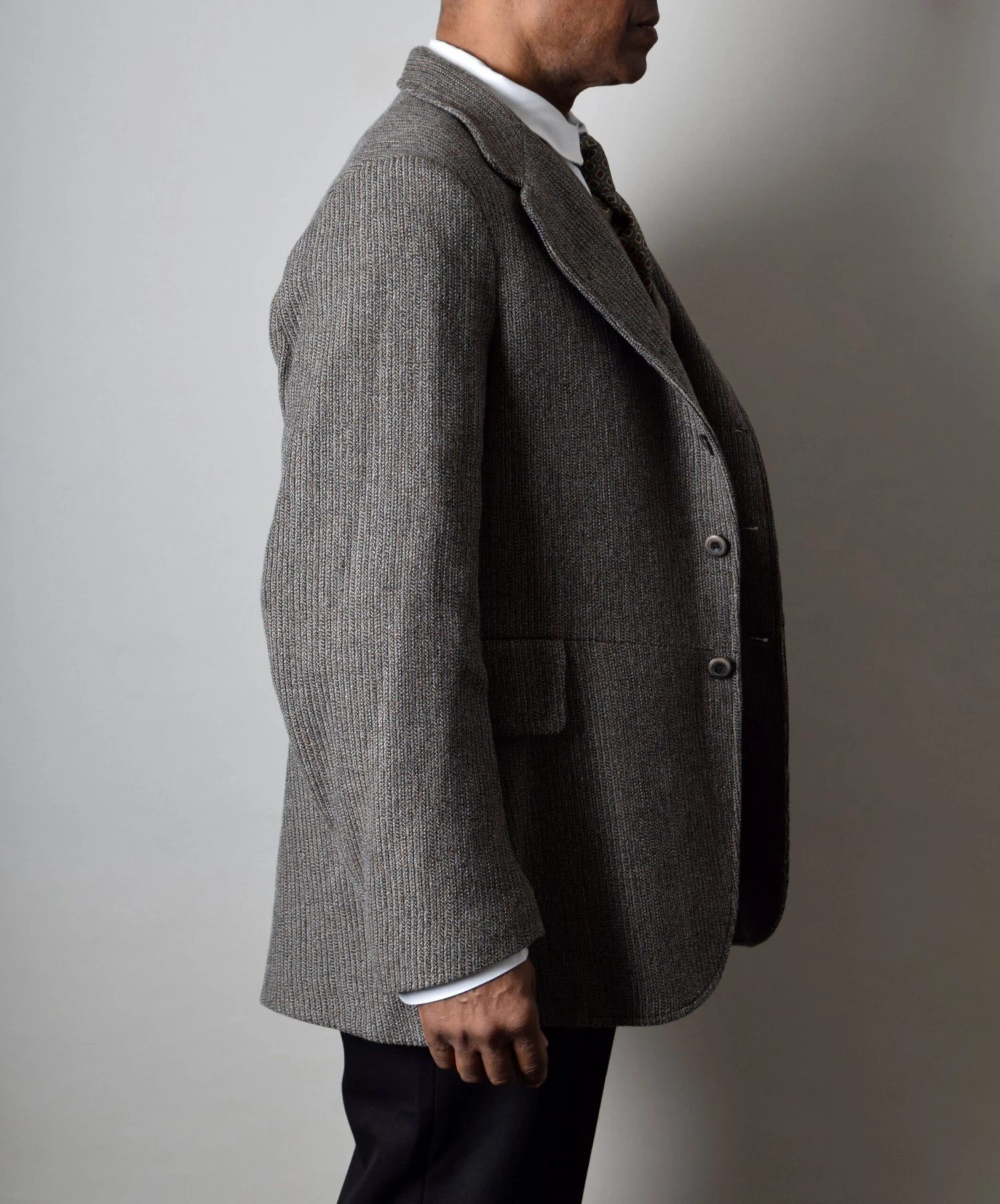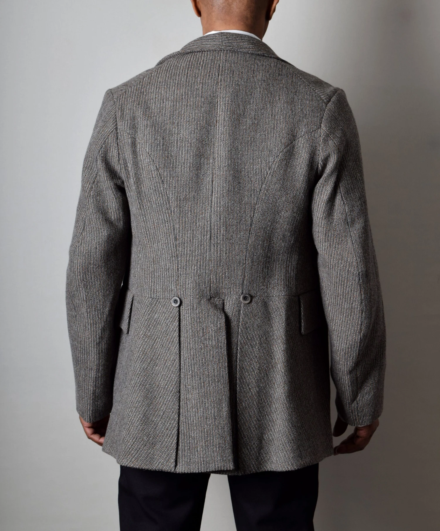 The back has a particularly distinctive cut with correct seaming and central vent in the skirt.