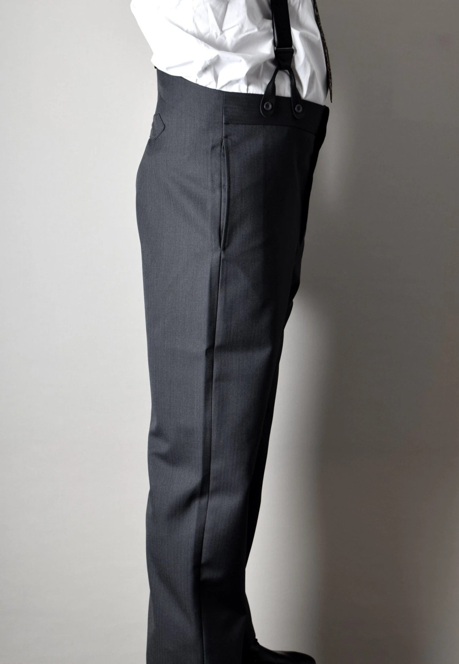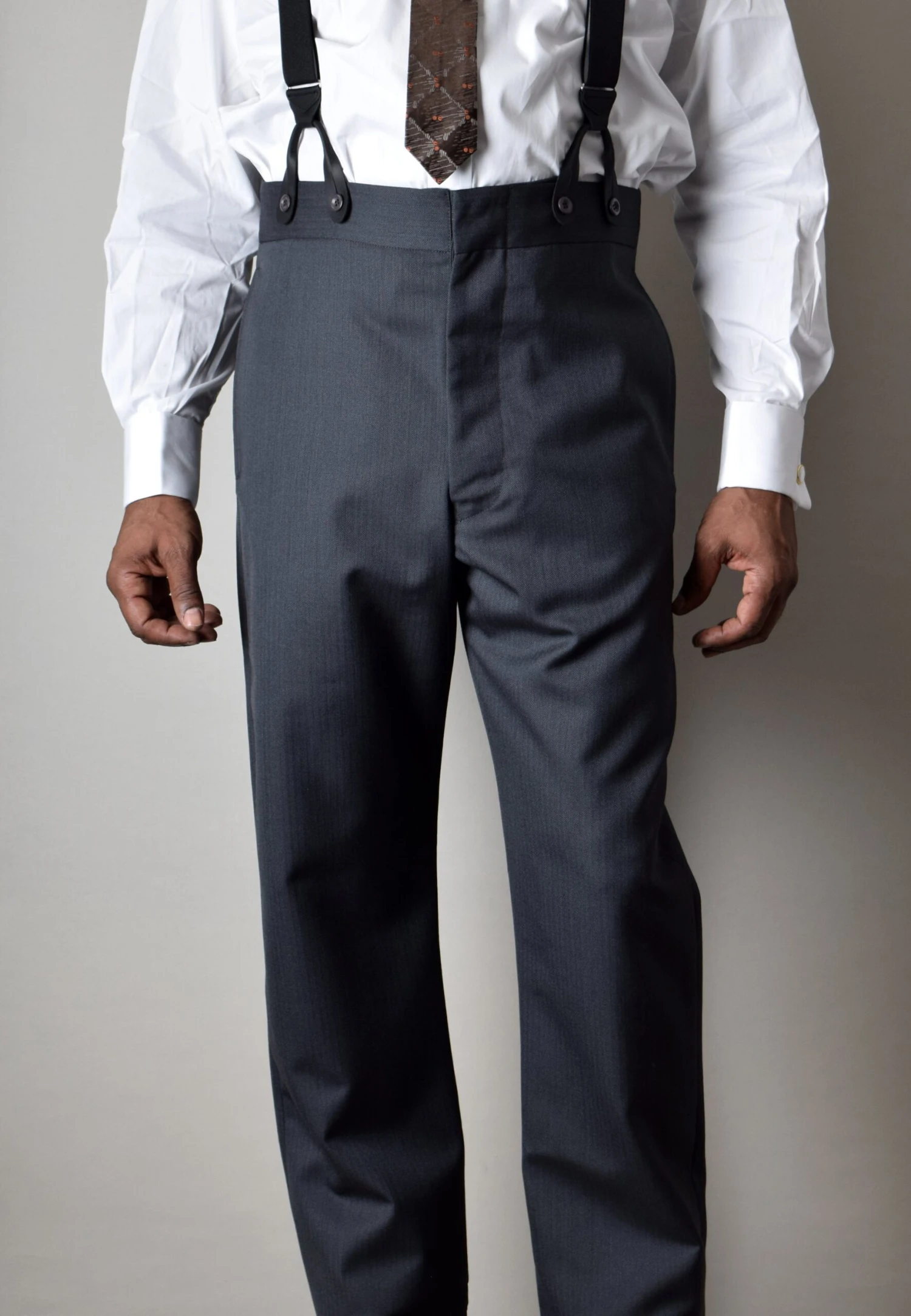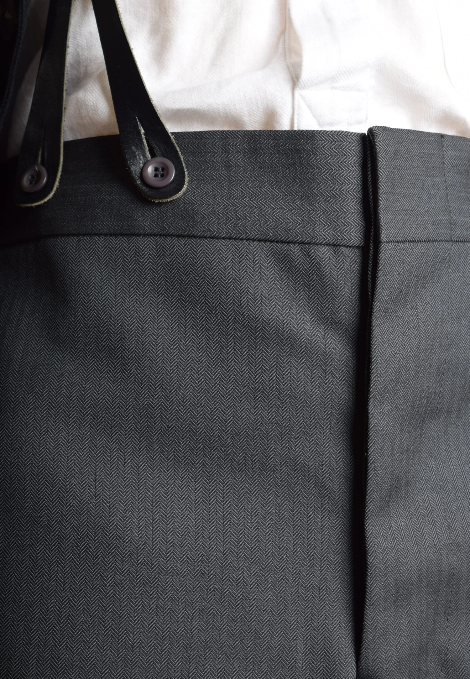 They are best worn with our button braces as they should sit higher on the body than the modern position which is lower towards the hips.
