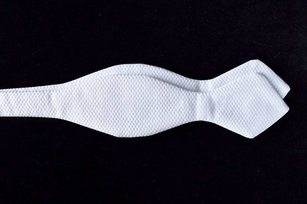 This narrow pointed end white cotton marcella bow tie is yet another variation for wearing at the most formal occasions.