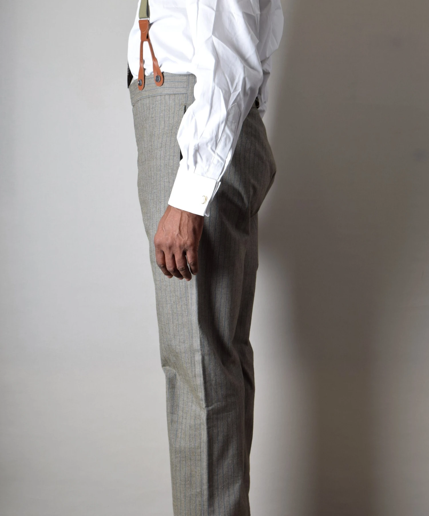 These traditional fishtail back trousers are cut using authentic pattern and are constructed in a grey/green cotton weave with a teal blue stripe. They are finished with a strap and buckle at the back along with braces buttons. The fly is fully buttoned and there are deep side pockets.