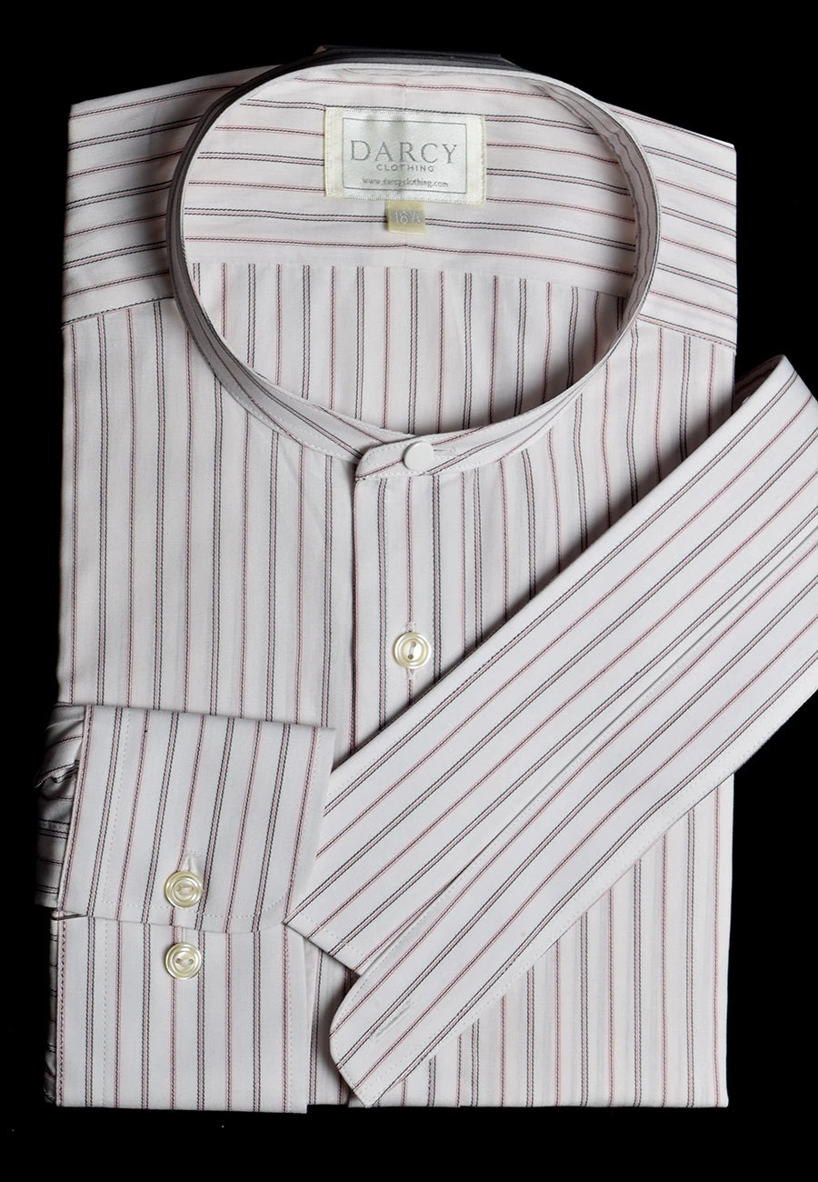 We have these neckband or collarless shirts made specially for us at Darcy Clothing. Unlike many tunic shirts the neckband is authentically very narrow which means it does not show above the collar. The cotton poplin used has been rewoven exclusively for us from original garments.
