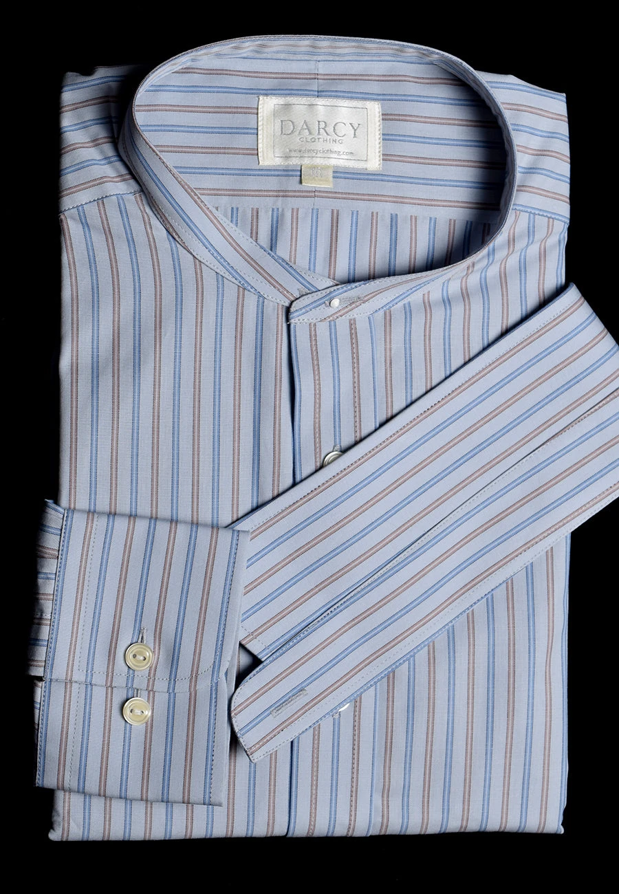 We have these neckband or collarless shirts made specially for us at Darcy Clothing. Unlike many tunic shirts the neckband is authentically very narrow which means it does not show above the collar. The cotton poplin used has been rewoven exclusively for us from original garments.