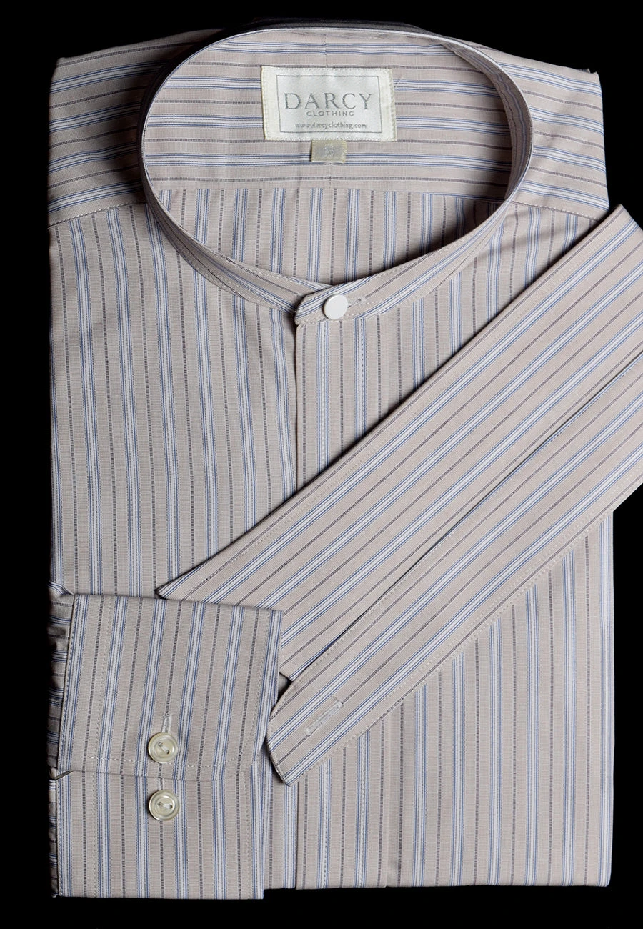 We have these neckband or collarless shirts made specially for us at Darcy Clothing. Unlike many tunic shirts the neckband is authentically very narrow which means it does not show above the collar. The cotton poplin used has been rewoven exclusively for us from original garments.