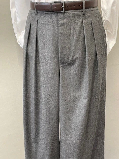 We are experimenting with making our pleated front trousers in grey flannel. This wool is so fabulously soft it doesn’t need lining. Drapes beautifully!