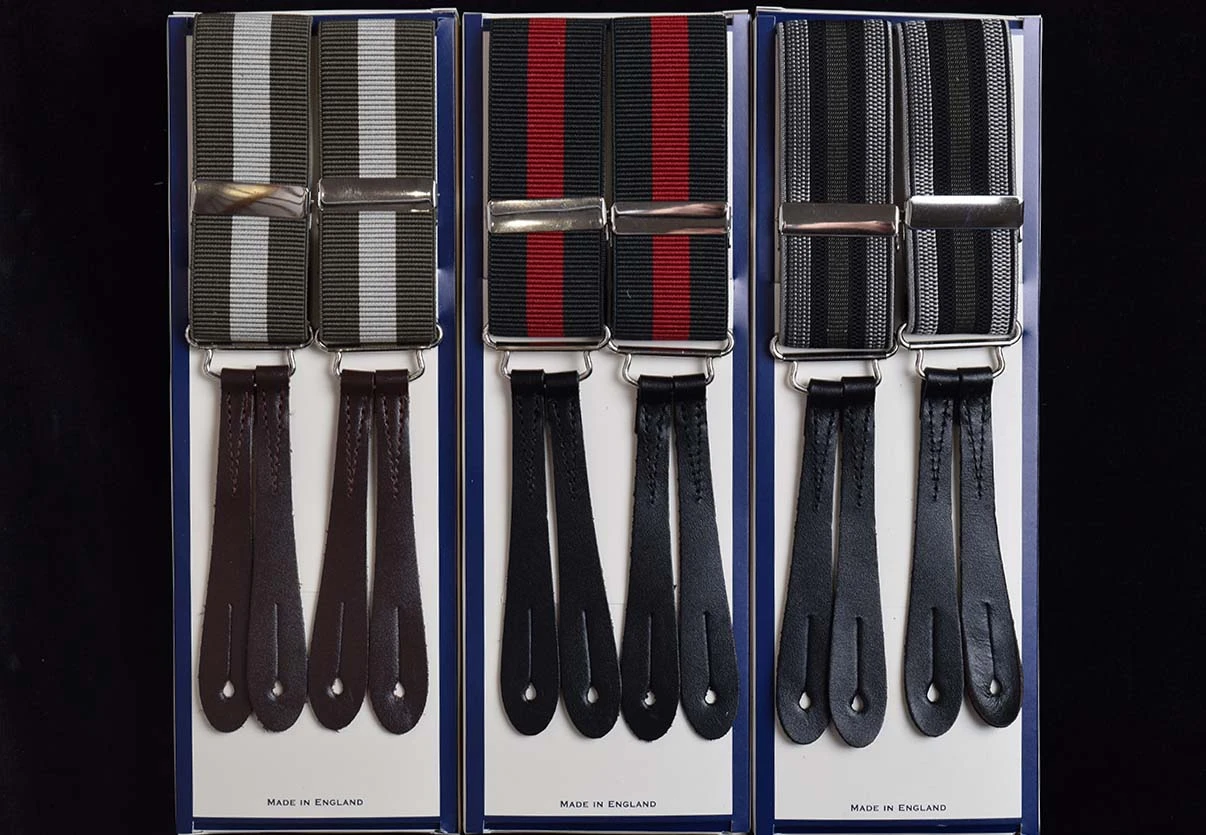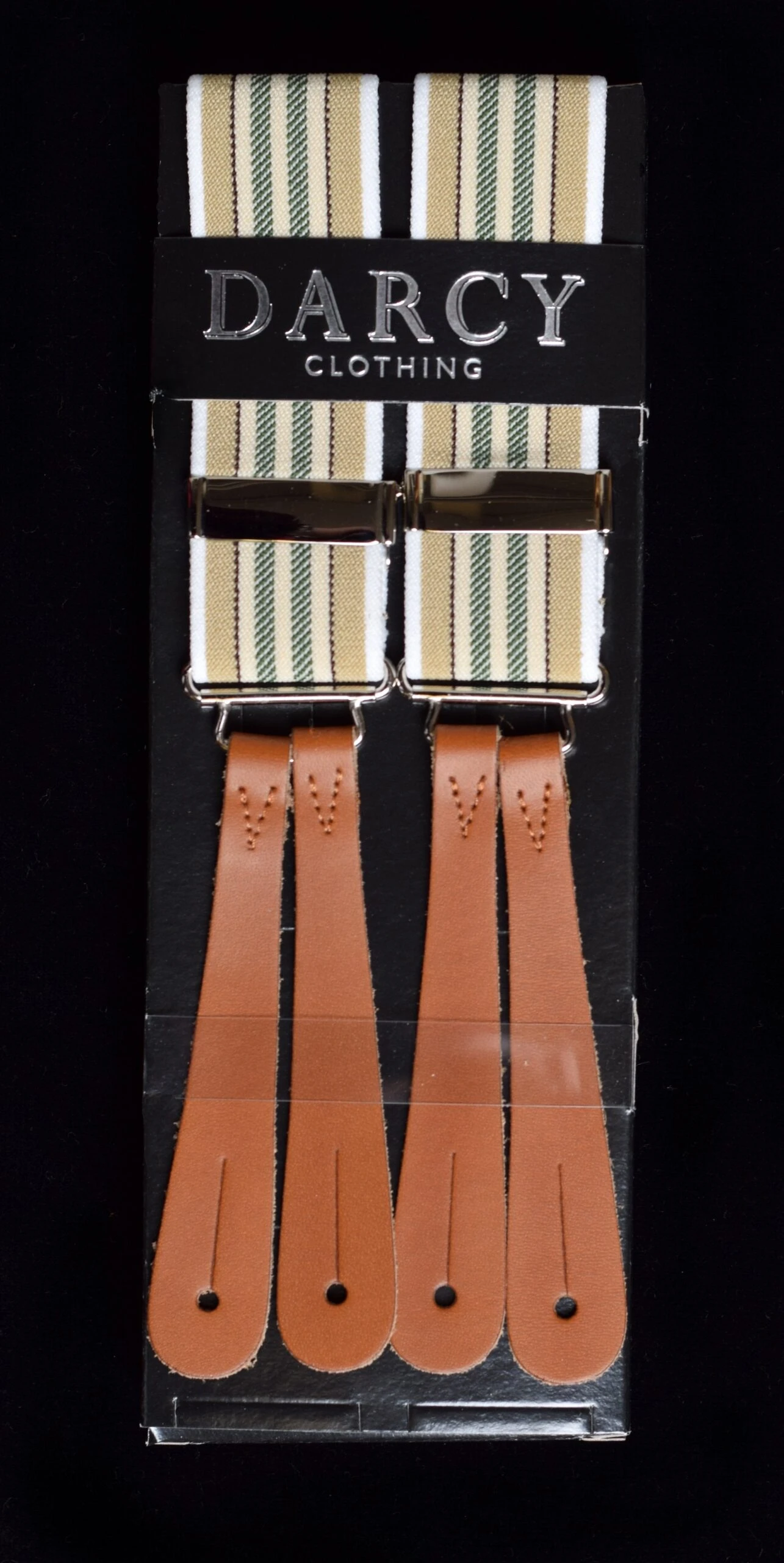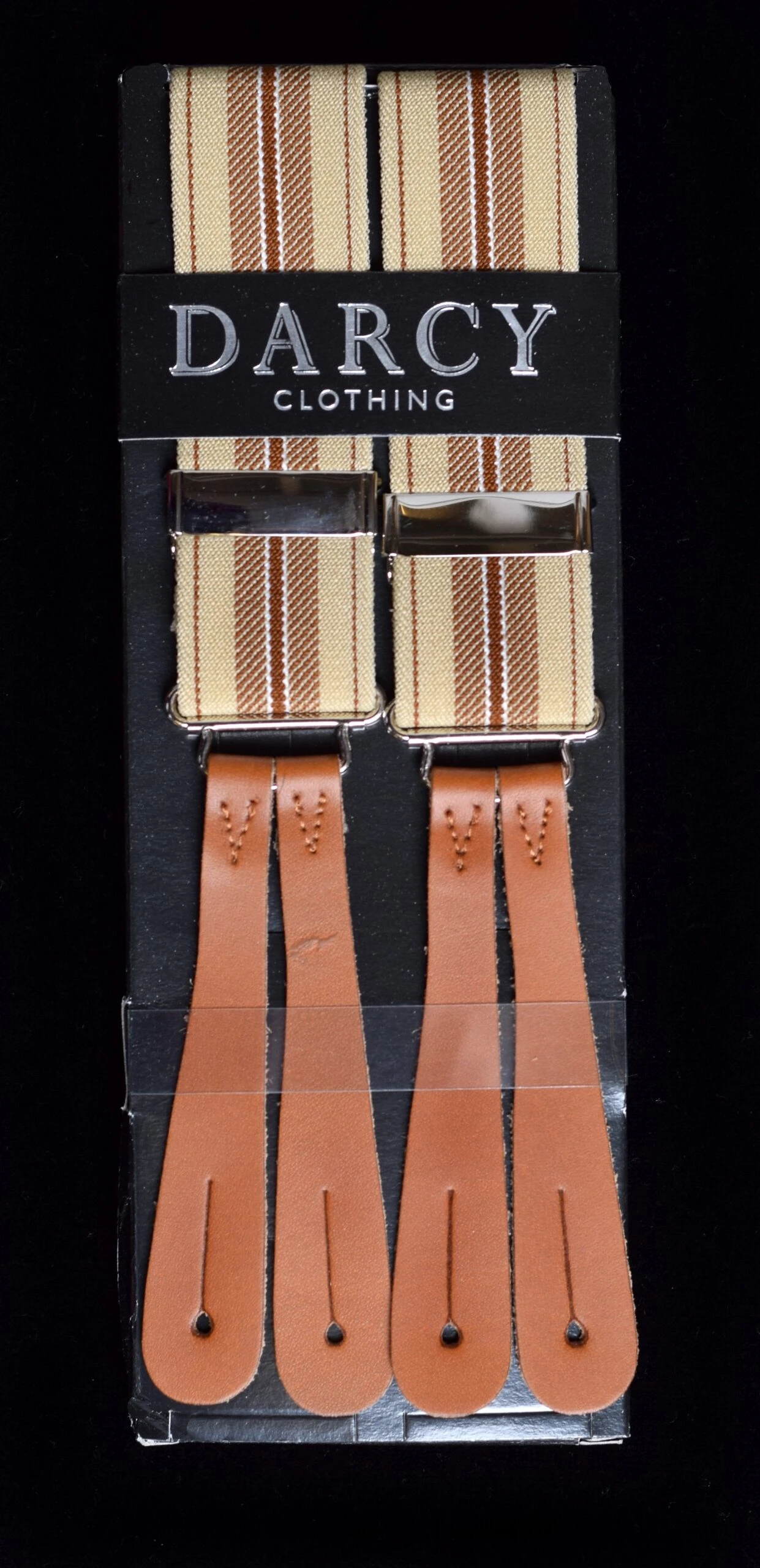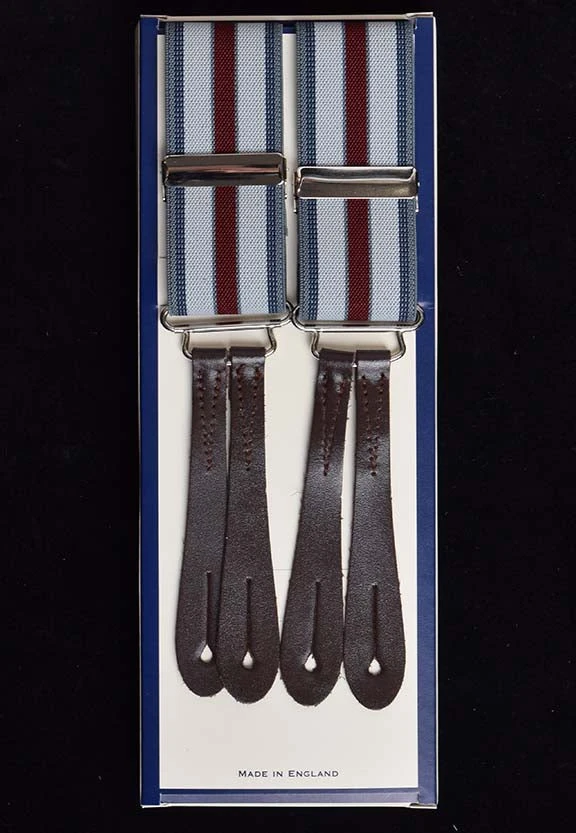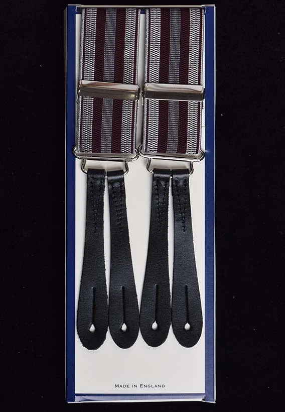 Robust button-on braces in muted stripes with traditional fixed leather ends. The Y back prevents these braces from slipping off shoulders. The straps are elasticated throughout.