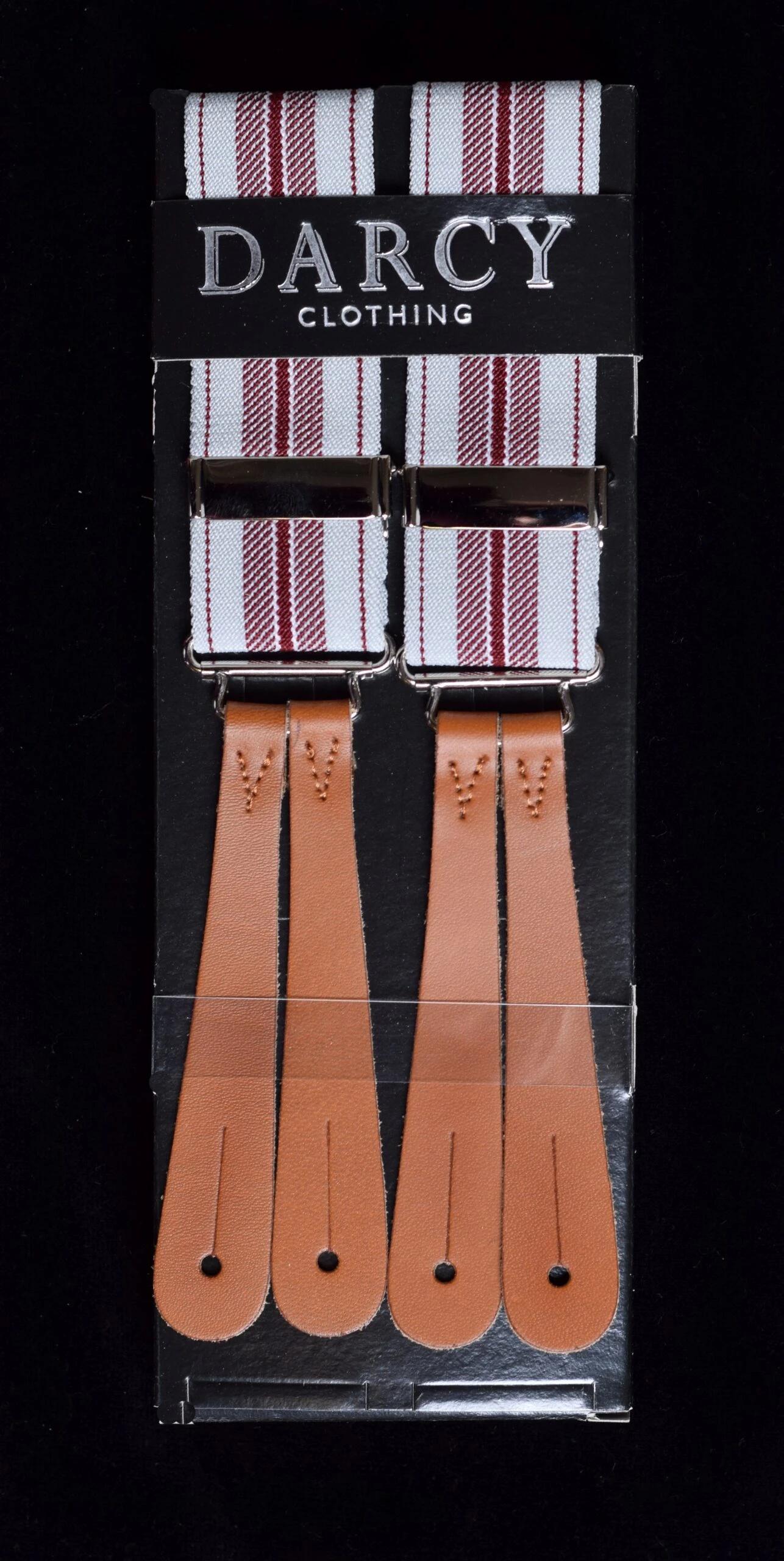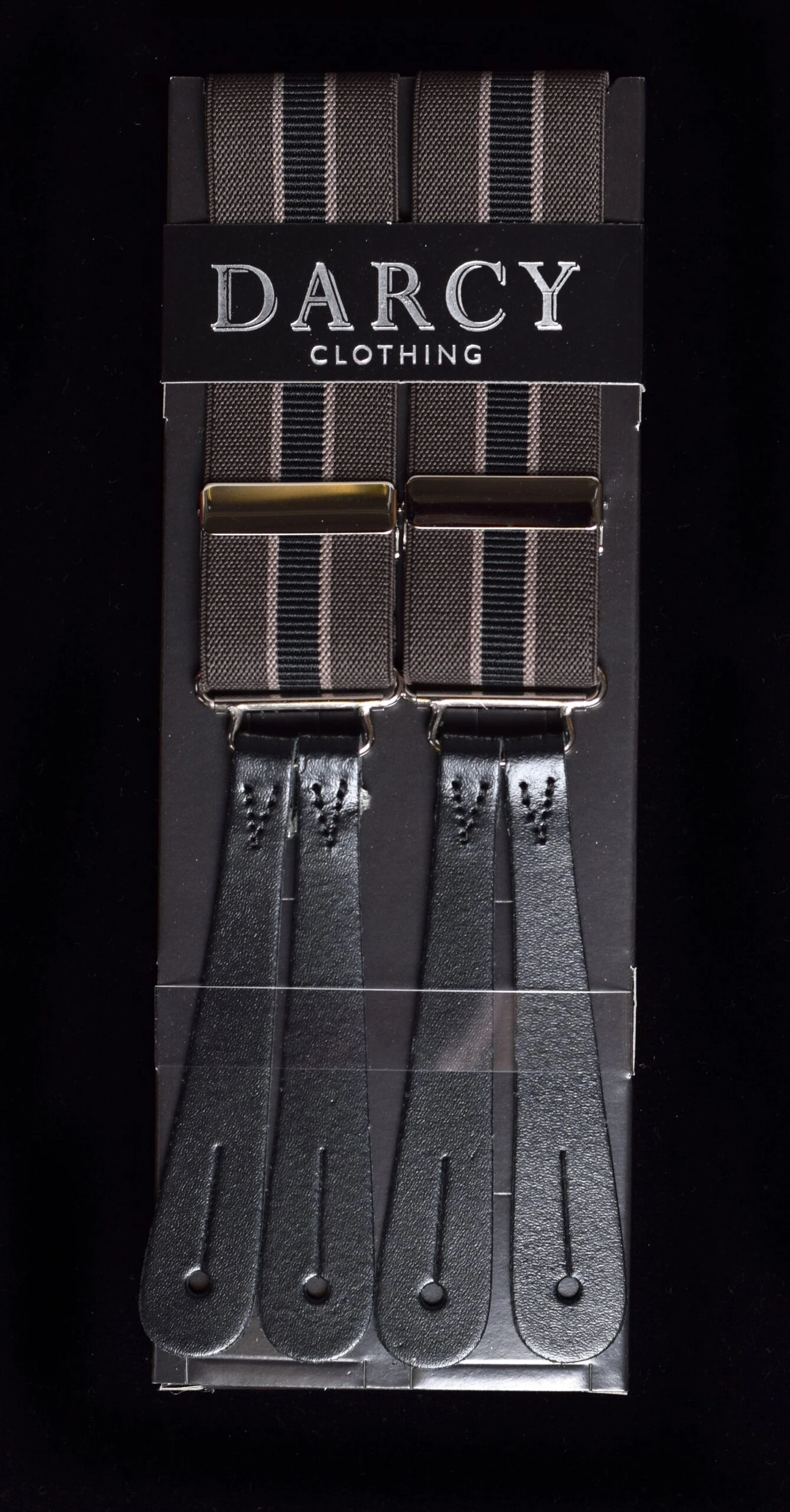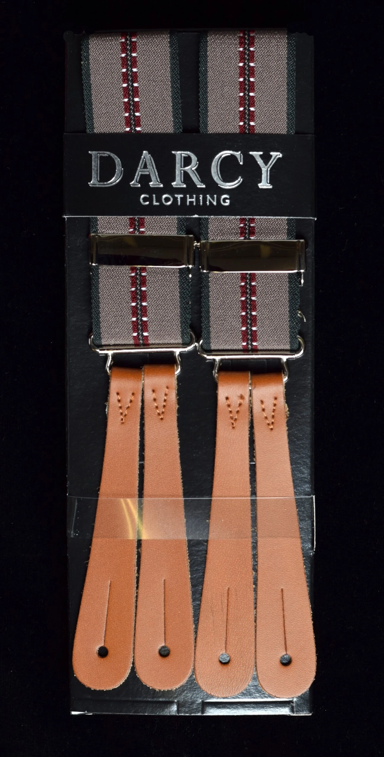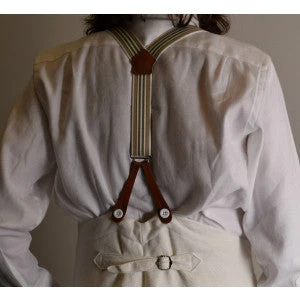 Robust button-on braces in muted stripes with traditional fixed leather ends. The Y back prevents these braces from slipping off shoulders. The straps are elasticated throughout.