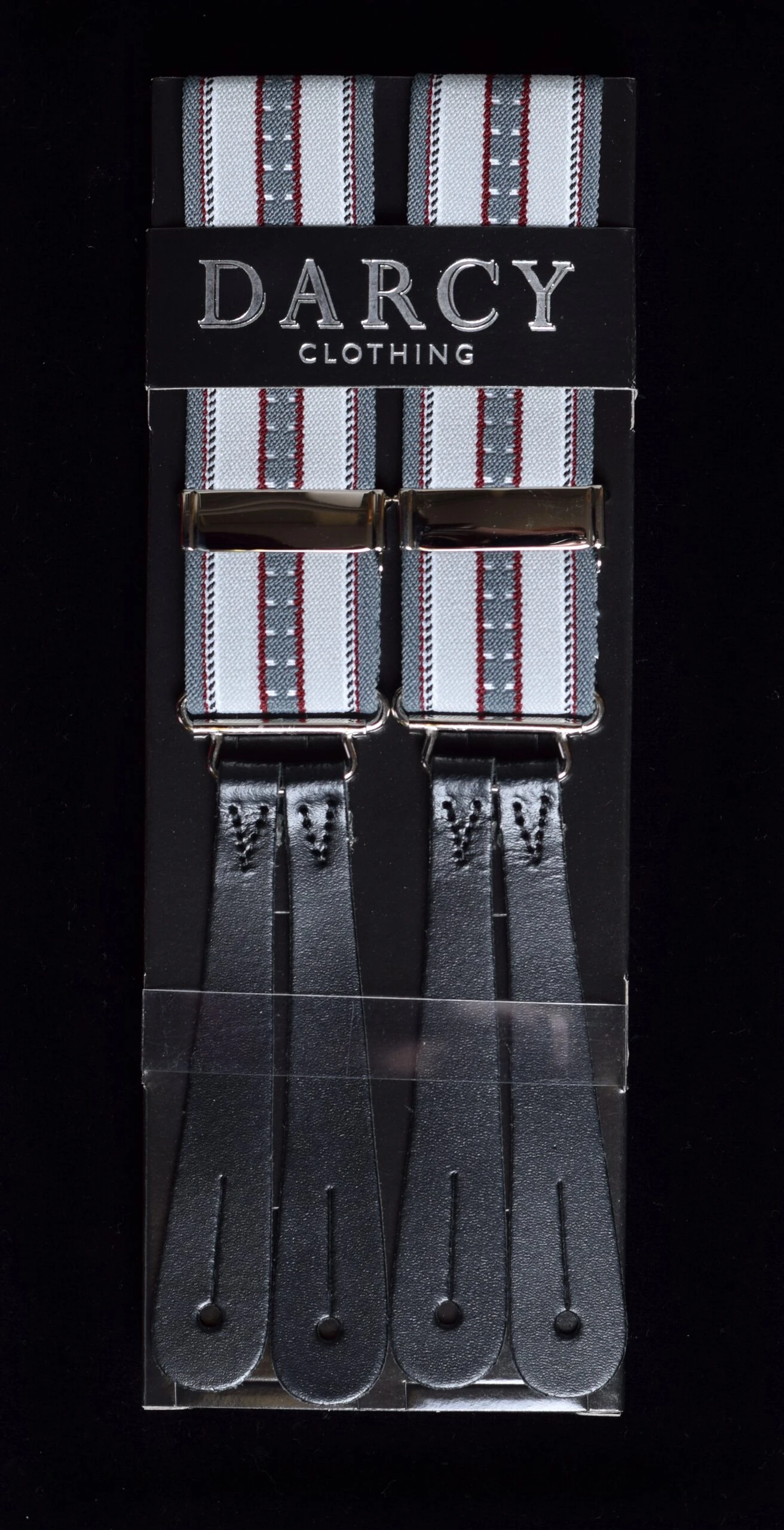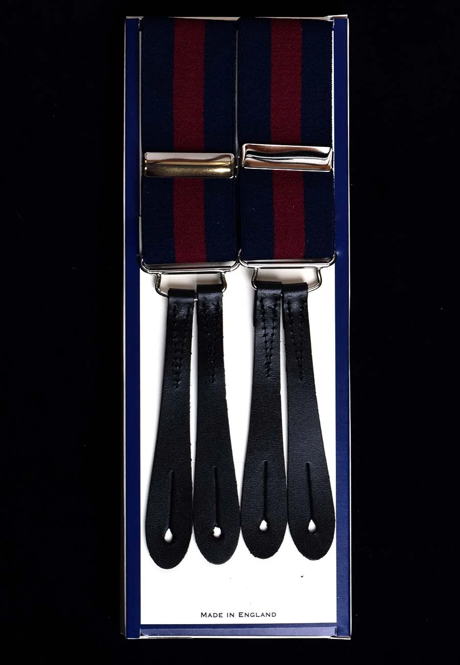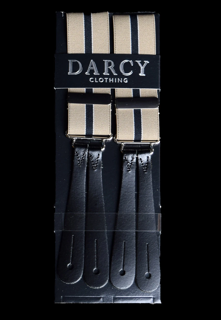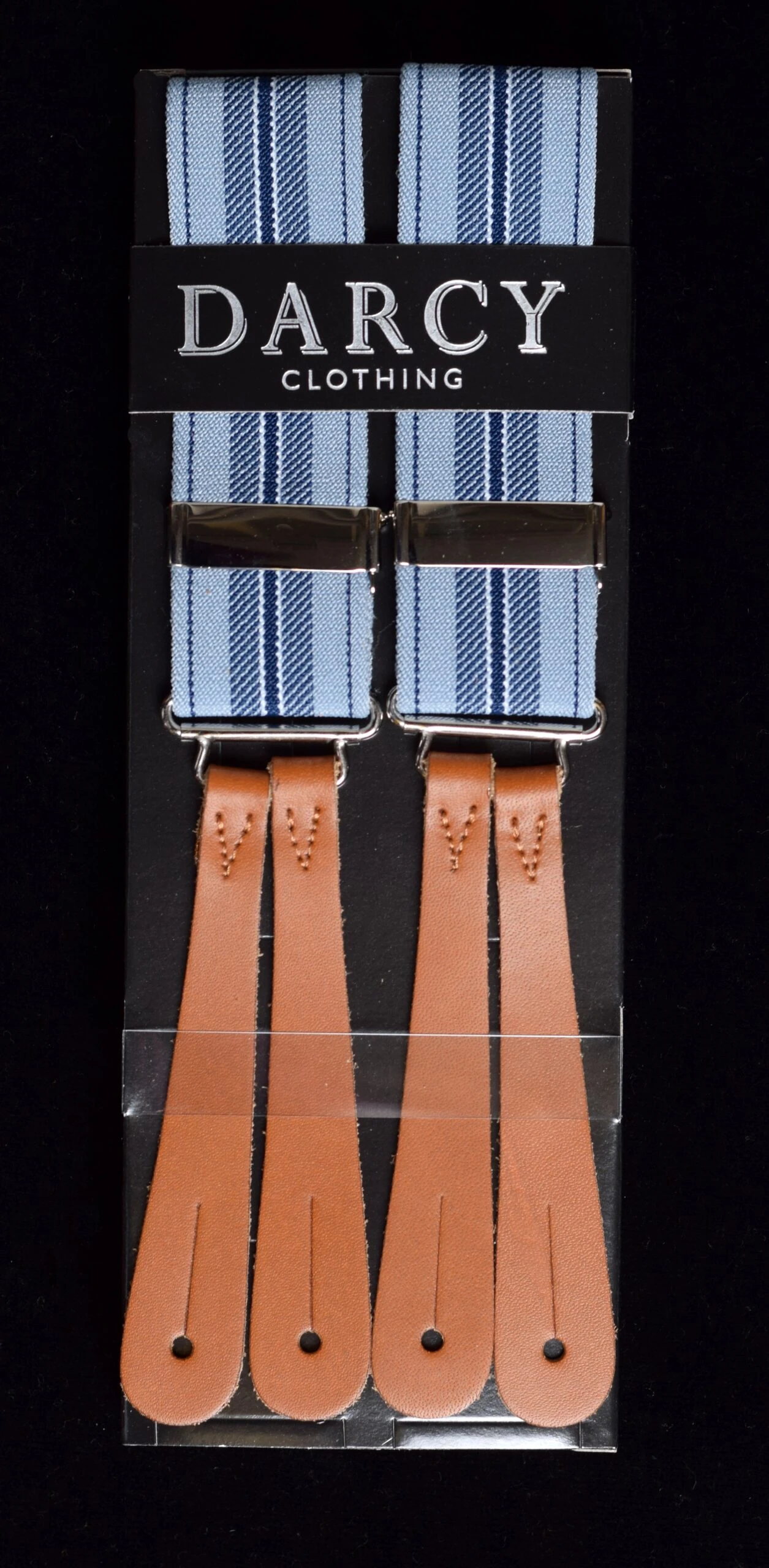 Robust button-on braces in muted stripes with traditional fixed leather ends. The Y back prevents these braces from slipping off shoulders. The straps are elasticated throughout.
