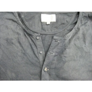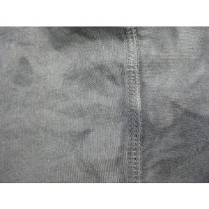 100% cotton, which even includes the overlocking. The only bits which don’t dye are the buttonholes and the thread used to sew on the buttons. Covered buttons. The cuffs have an authentic ribbed finish. The cotton jersey is a natural colour with husk flecks.
