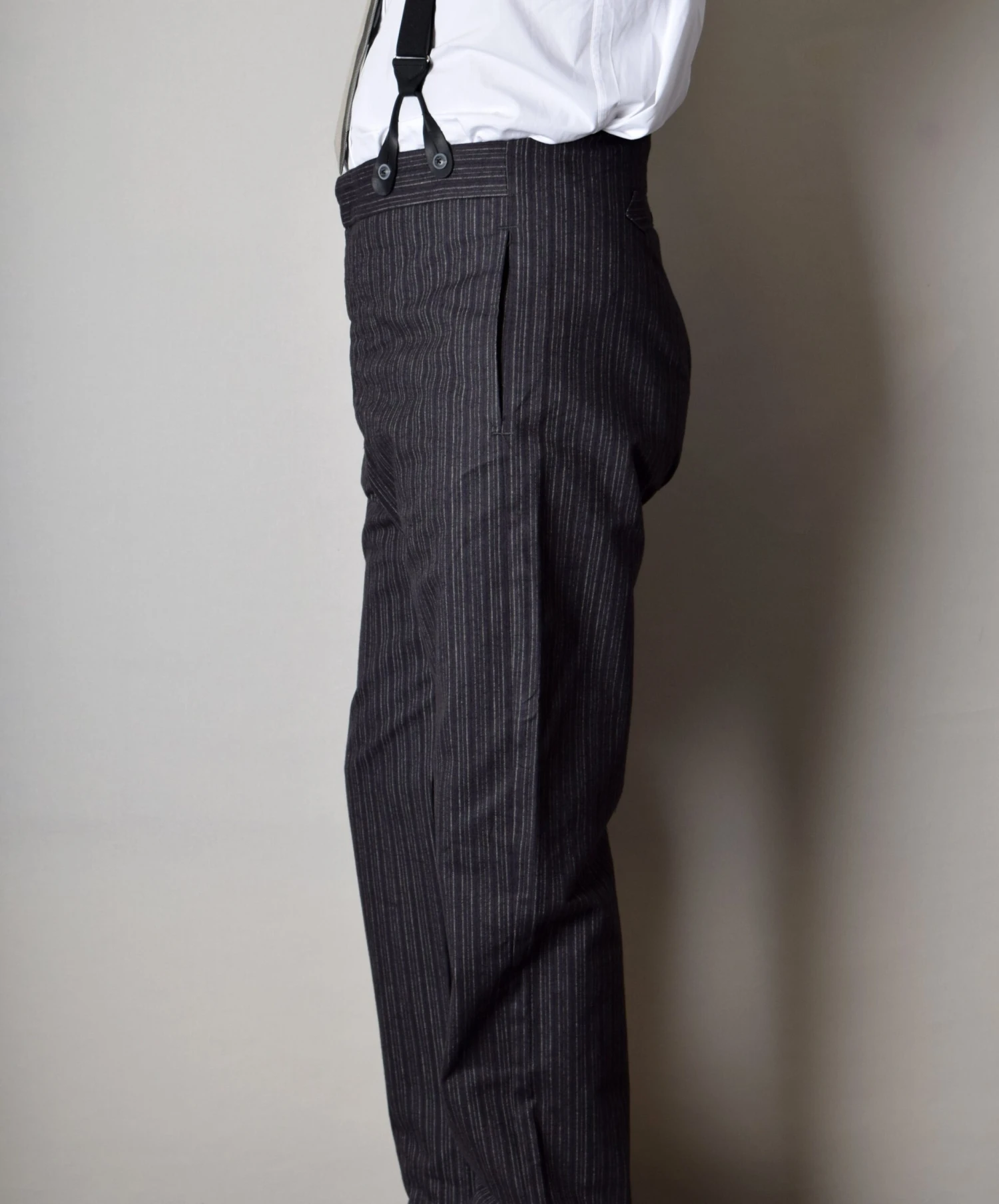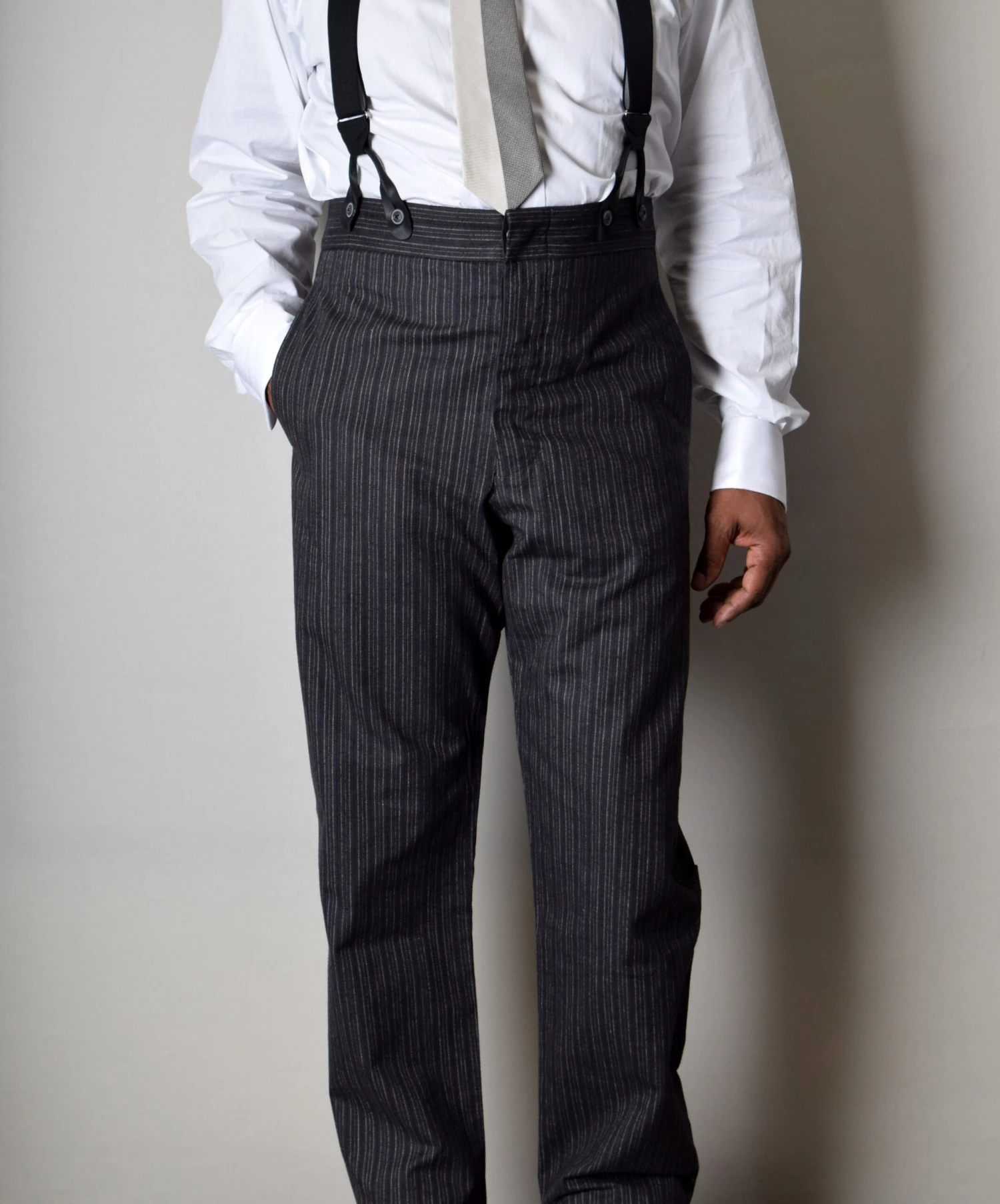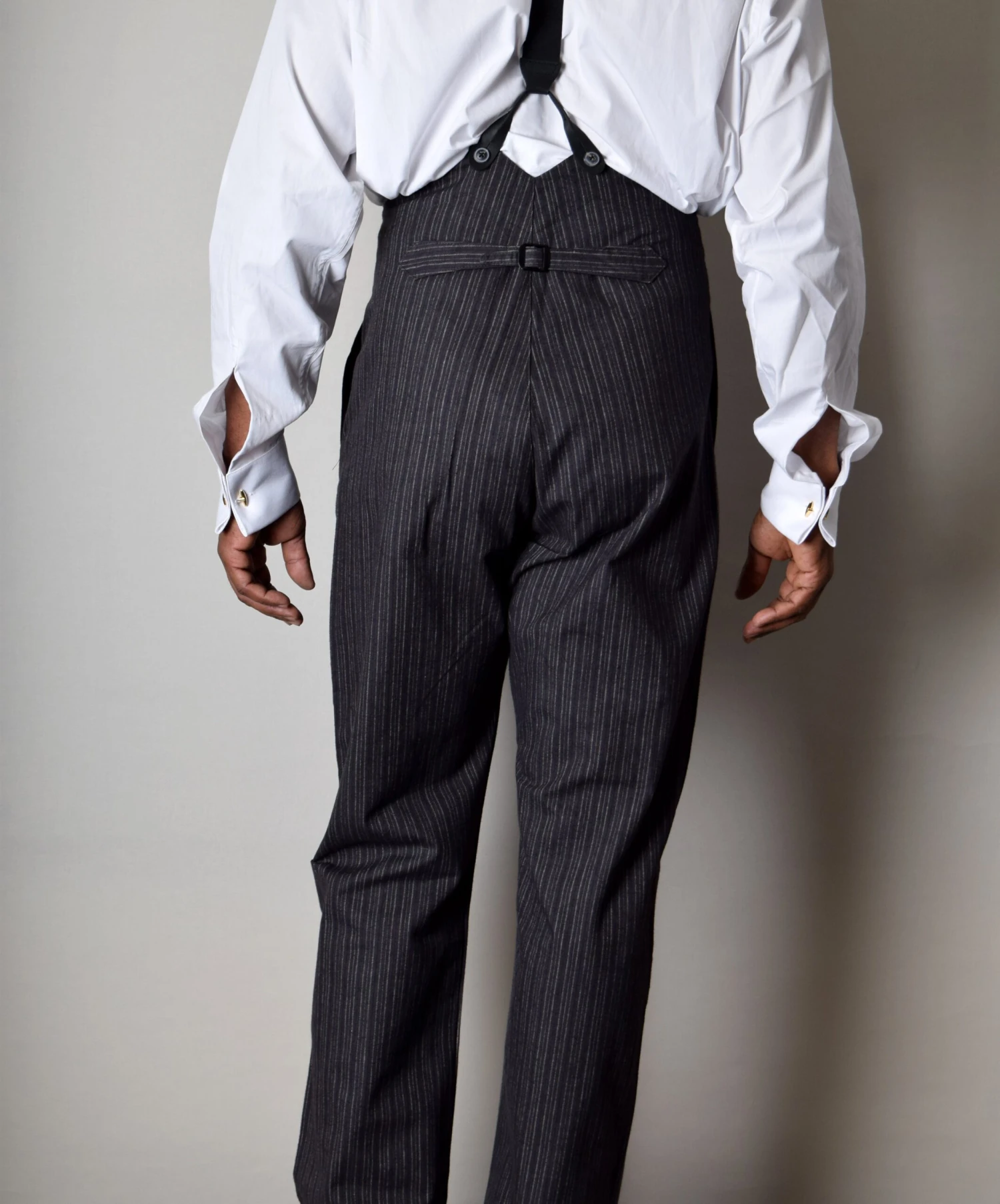 These traditional fishtail back trousers are cut using authentic patterns and constructed of 100% cotton in an elegant grey stripe, perfect for cowboys or bank managers down on their luck. They are finished with a strap and buckle at the back along with braces buttons. The fly is fully buttoned and there are deep side pockets.