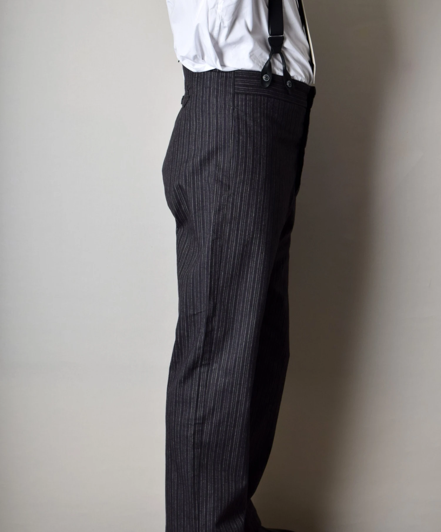 They are best worn with our button braces as they should sit higher on the body than the modern position which is lower towards the hips.