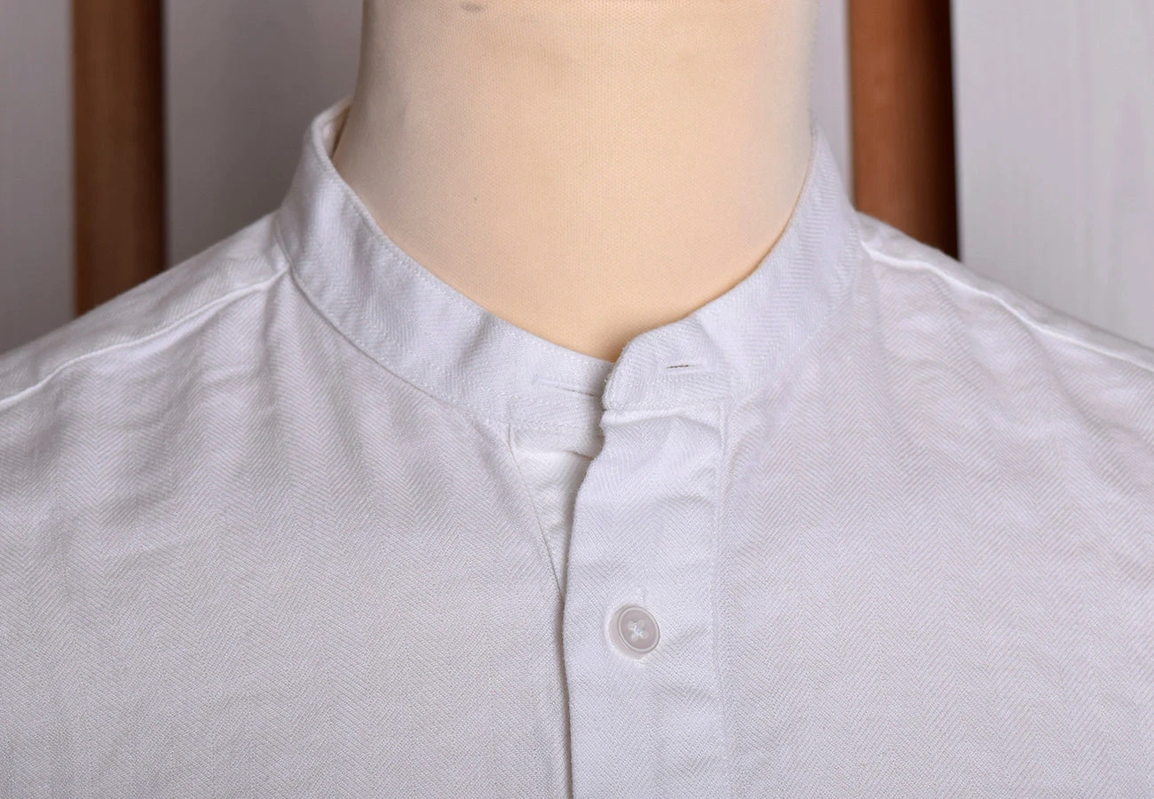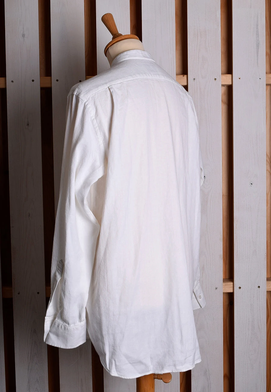 We are very pleased to have made another variation on the very popular half placket shirt. This time we have used a relaxed linen/cotton fabric which is woven with a textured herringbone pattern. When washed it becomes delightfully soft and floppy.